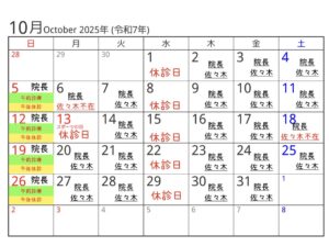 2025年10月出勤獣医師・診療日カレンダー