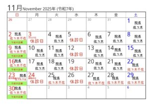 11月の最終週は、院長だけでの診療になる為、大変混み合いますので、お時間に余裕を持ってお越しください。